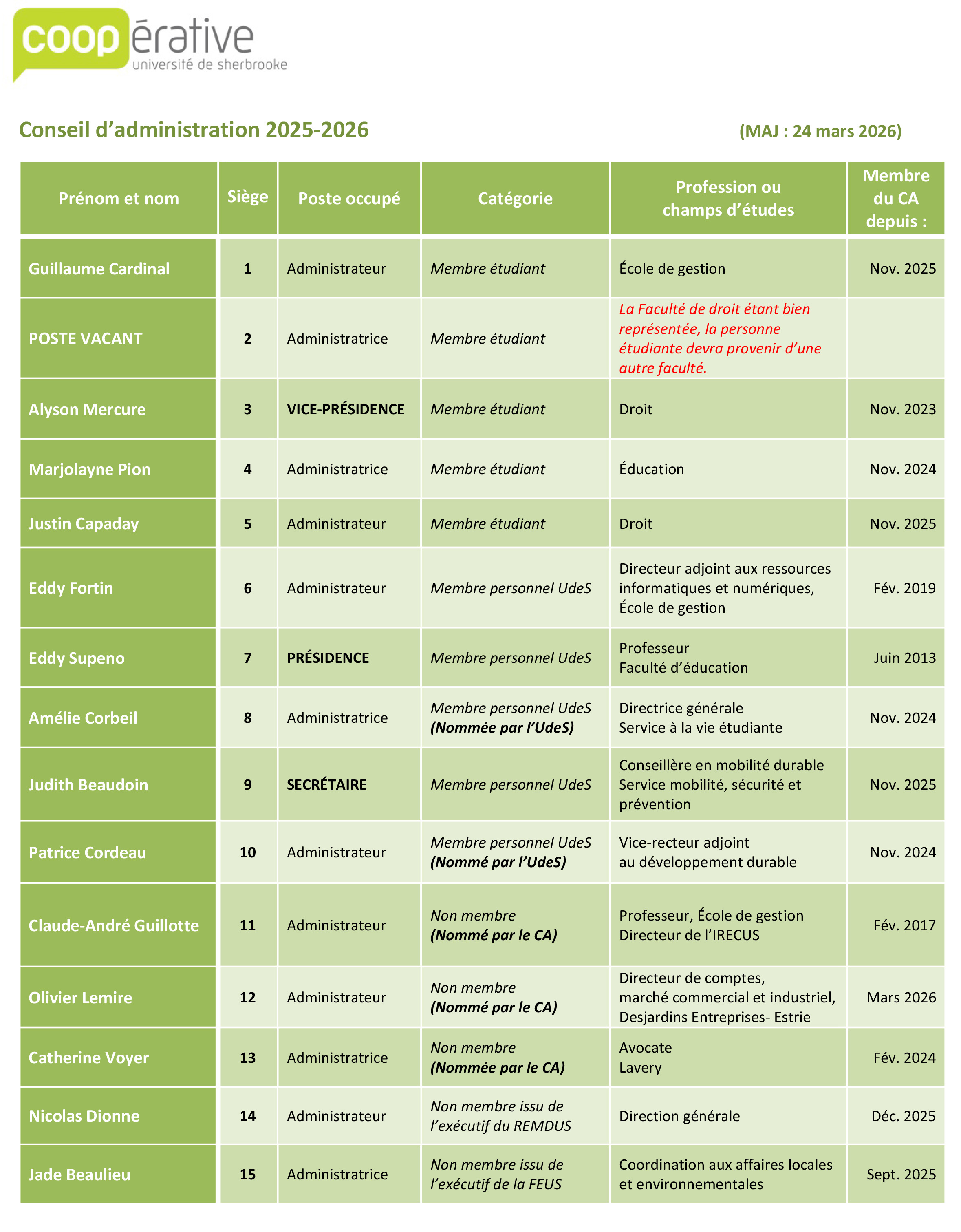Conseil d’administration 2025-2026 (mise à jour : 24 mars 2026)