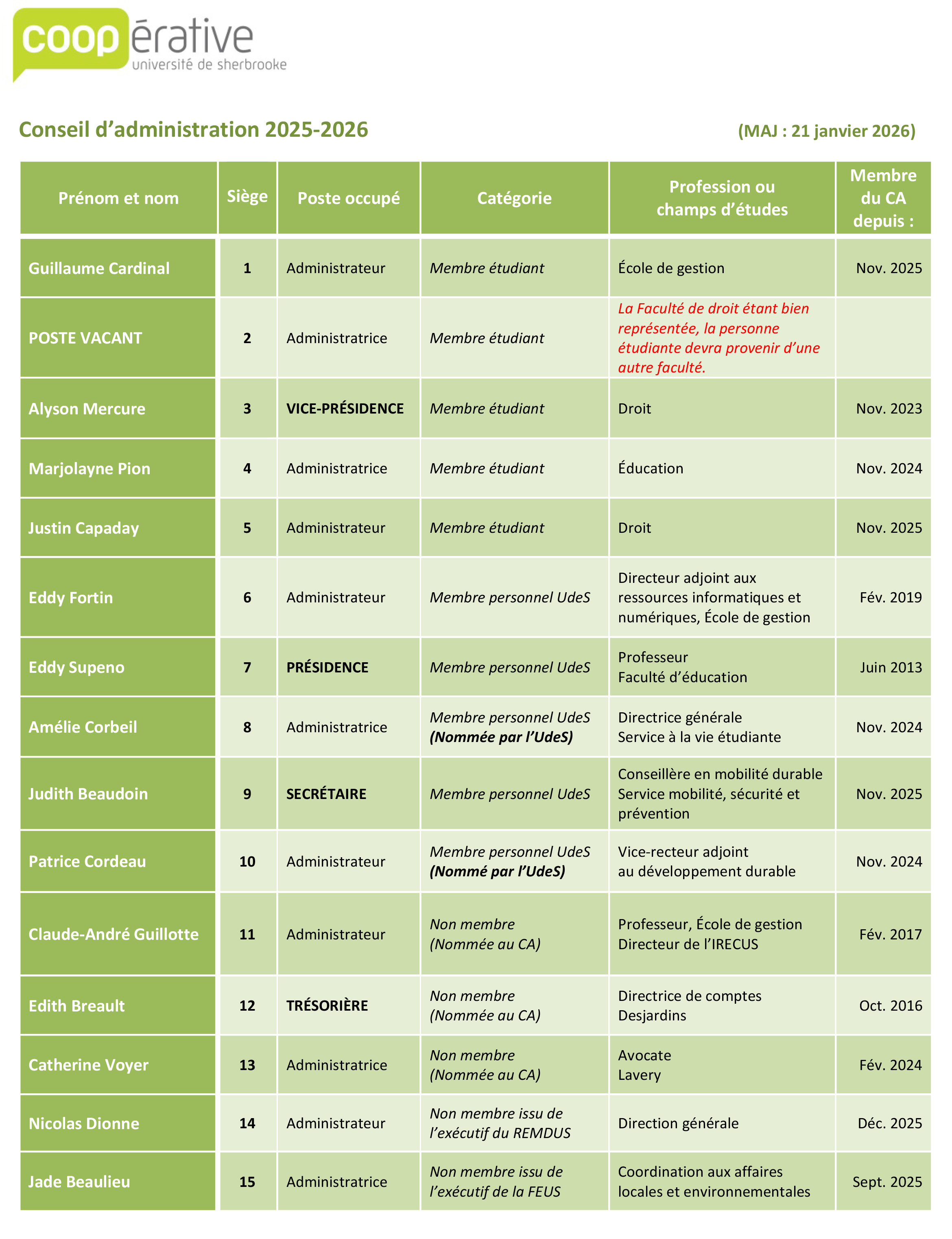 Conseil d’administration 2025-2026 (mise à jour : 21 janvier 2026)